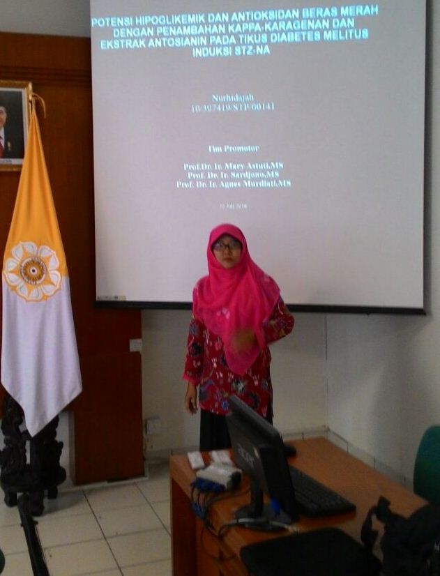 Nurhidajah STP MSi dosen dari Prodi Teknologi Pangan Universitas Muhammadiyah Semarang (UNIMUS) berhasil mempertahankan Disertasinya di hadapan penguji Program Doktor Ilmu Pangan Universitas Gajah Mada (UGM) Yogjakarta Jumat 22 Juli 2016, sehingga berhak menyandang gelar Doktor. Tim Penguji terdiri dari Dr Ir Nursigit Bintoro MSc (Ketua Sidang), Prof Dr Ir Mary Astuti MS (Promotor), Prof Dr Ir Sardjono MS (Co-Promotor), Prof Dr Ir Agnes Murdiati MS (Co-Promotor), Prof Dr Ir Y Marsono (Ketua Tim Penilai), Prof Dr Ir Umar Santoso MSc (anggota), Dr Sunarti MKes (anggota), Prof Dr Ir Djagal W Marseno M Agr (Penguji) dan Dr Ir Nurrahman MSi (Penguji). Nurhidajah yang akrab dipanggil Bu Inung lulus dengan predikat sangat memuaskan.