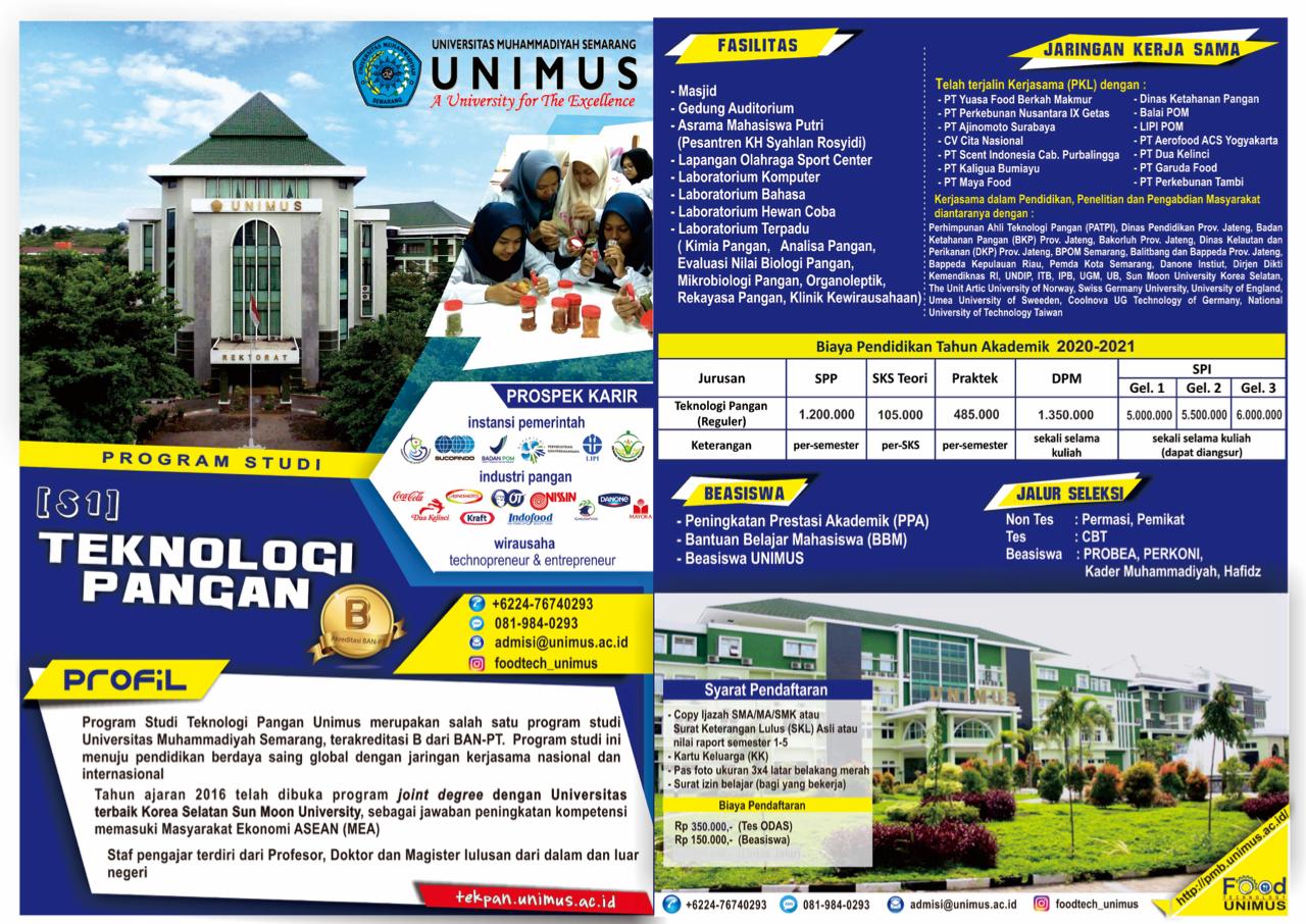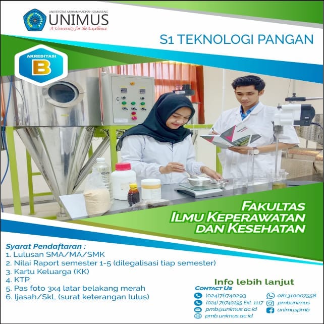 Dengan tag line “Healthy Food Innovator and Enterpreneur” Prodi Teknologi Pangan Unimus telah meluluskan 15 angkatan dengan sebaran alumni bekerja di berbagai bidang, termasuk berwirausaha di bidang pangan. Simak kegiatan-kegiatan mahasiswa dan kompetensi dosennya di web https://tekpan.unimus.ac.id/ dan untuk pendaftaran silahkan hubungi di http://pmb.unimus.ac.id/