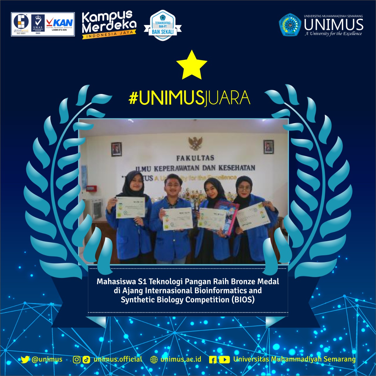 di Ajang Internasional Bioinformatics and Synthetic Biology Competition (BIOS). Selamat dan Sukses kepada mahasiswa S1 Teknologi Pangan Fakultas Ilmu Keperawatan dan Kesehatan UNIMUS Camilia Evril (Ketua), Syofiyatun Fadzilah, Riska Amalia, Natasya Aulia dan Damar Bima Wicaksono.