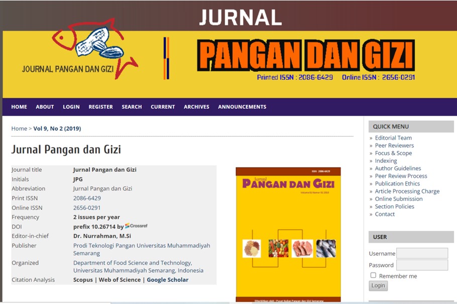 Bagi peneliti, para dosen dan mahasiswa dapat mensubmit artikelnya pada laman JPG Unimus dan kontak dapat menghubungi Sekretariat JPG. Jurnal pangan dan Gizi sampai saat ini sudah di tahun ke 12 sejak pertama kali menerbitkan tahun 2010, sebagai jurnal berkala terbit dua kali setahun. Dr Ir Nurrahman MSi sebagai kepada editor dibantu dewan editor Dr Nurhidajah STP, MSi dan Dr Siti Aminah STP MSi dari Unimus dan Dr Ir M P Rohadi dari Universitas Semarang, dengan penyunting pelaksana Dr Agus Suyanto STP MSi, Dr (cand) Diode Yonata STP Msi dan Aniatun Linaf’ah STP.