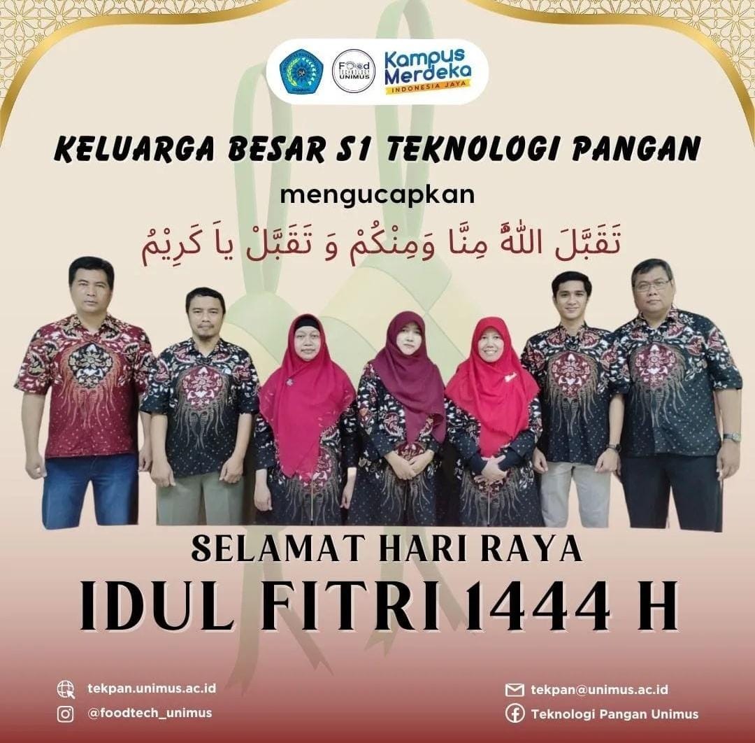Prodi Teknologi Pangan Unimus mengucapkan “Selamat Idul Fitri 1444H” kepada civitas akademika yaitu seluruh staff, mahasiswa, dan keluarga besarnya. Bersinergi, bersama-sama meningkatkan kualitas SDM untuk kemashlahatan bersama. “Romadhan membekali kita peningkatan ketaqwaan merupakan modal utama bagi peningkatan SDM.”