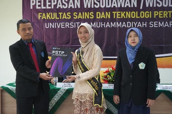 Nikmah Yuniarti mendapat ucapan selamat dan pemasangan selempang oleh Dekan FSTP Dr Nurhidayah sebagai wisudawab berprestasi dengan IPK 3,96. “Kami mengucapkan rasa syukur kepada Allah dan memberikan ucapan terimakasih kepada orang tua, para dosen, tenaga kependidikan dan orang-orang yang sudah membantu dalam meraih cita-cita menjadi sarjana”, sambut Nikmah.