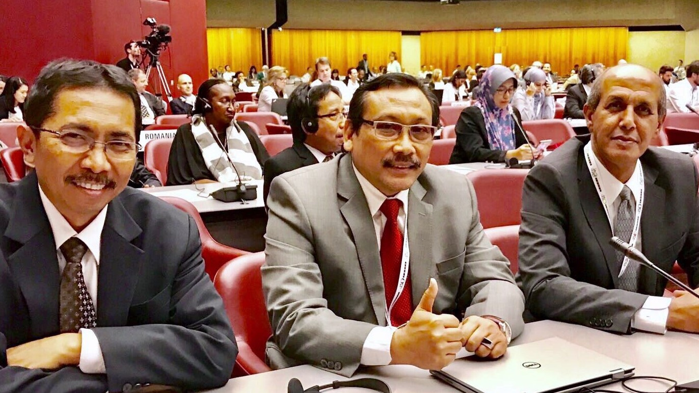 Jenewa, Swiss: Kandidat Indonesia, Prof. Purwiyatno Hariyadi terpilih sebagai Wakil Ketua Codex Alimentarius Commission (CAC) periode 2017-2018 pada pemilihan yang berlangsung selama Pertemuan CAC ke-40 di Jenewa (19/7). Prof. Purwiyatno Hariyadi (Wakil Ketua CAC, kiri), Dr. Bambang Prasetya (Kepala Badan Standarisasi Nasional, kanan) dan Watapri Jenewa, Duta Besar Hasan Kleib pada sidang pleno pemilihan Wakil Ketua CAC, Jenewa, 19 Juli 2017.