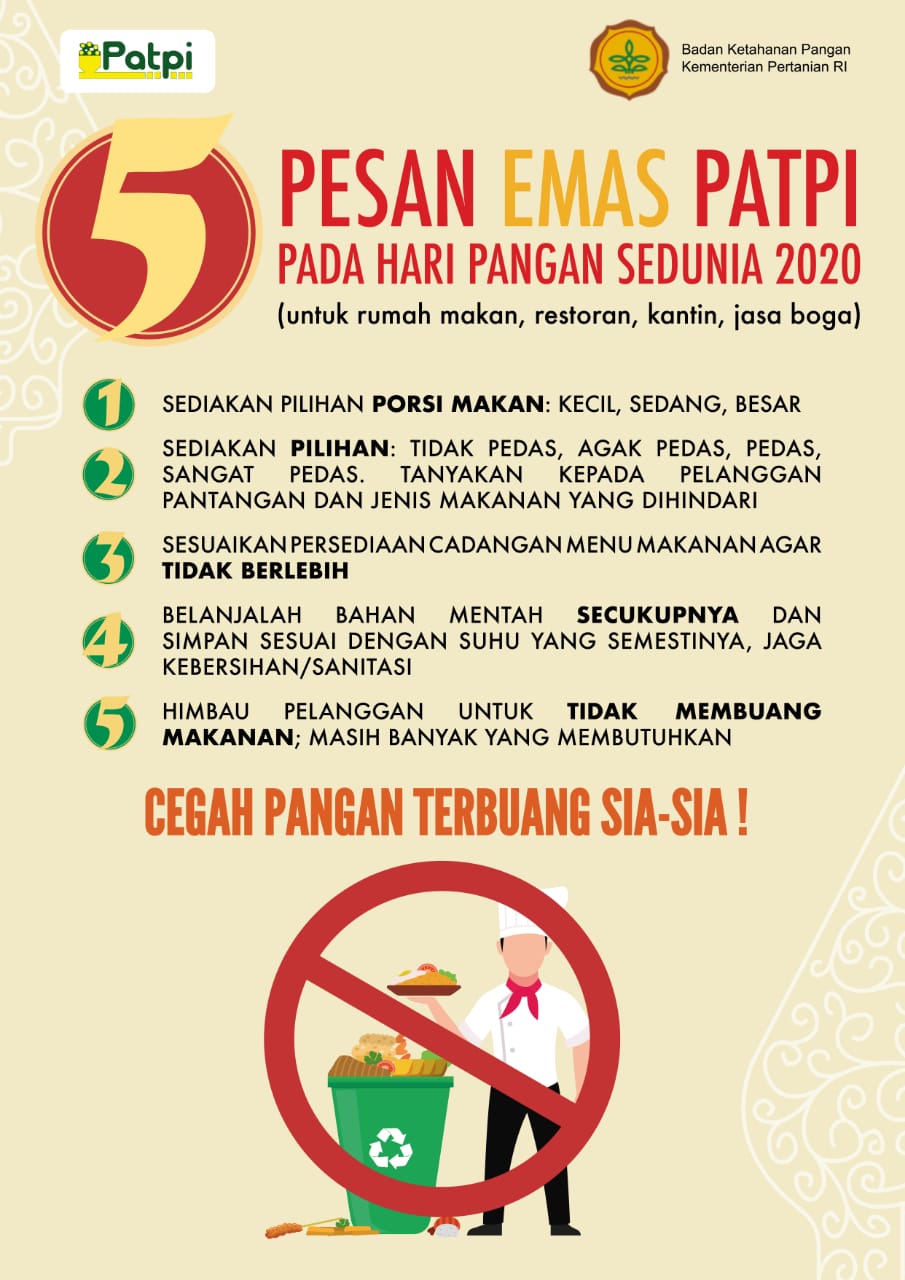 Hari ini, 16 Oktober 2020 merupakan hari pangan sedunia (HPS) ke 40. PATPI (Perhimpunan Ahli Teknologi Pangan Indonesia) menyampaikan pesan untuk mengurangi pangan yang terbuang dan pangan yang rusak (food waste dan food loss) ditujukan kepada pengusaha rumah makan, restoran, kantin, dan jasa boga. “Kampanye PATPI tahun ini bertemakan sama dengan tahun kemarin yaitu perlunya hemat dalam mengkonsumsi pangan, tidak boros, apalagi sampai membuang-buang pangan. Bedanya, kalau tahun ini pesan itu ditujukan kepada pengelola rumah makan atau restoran, tahun lalu pesan ditujukan untuk konsumen,” jelas Agus Suyanto STP, MSi, anggota PATPI Semarang dosen Prodi Teknologi Pangan Unimus. (more…)
